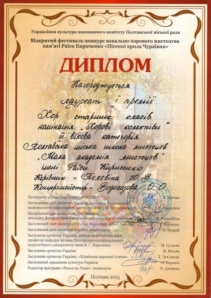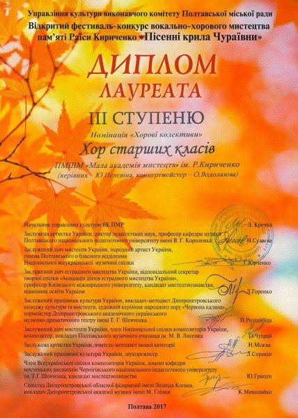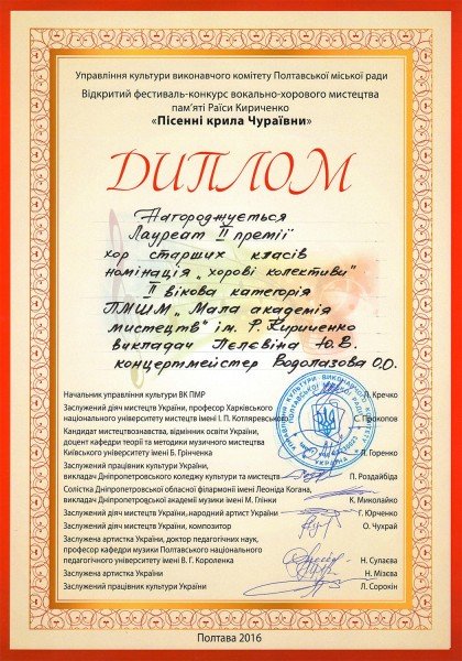 За цей період хор приймає активну участь у шкільних святкових концертах, звітних концертах вокально-хорового відділу та ПМШМ «Мала академія мистецтв», святкових концертах до дня перемоги та дня міста. Репертуар хору складають твори українських та зарубіжних авторів, обробки українських народних пісень.