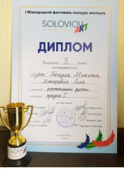Дует у складі: Макаревич Ілля (викладач Літвінова В.І.).та Боцула Микита (викладач Литвиненко Т.І.) отримали диплом Лауреат 2 премії.