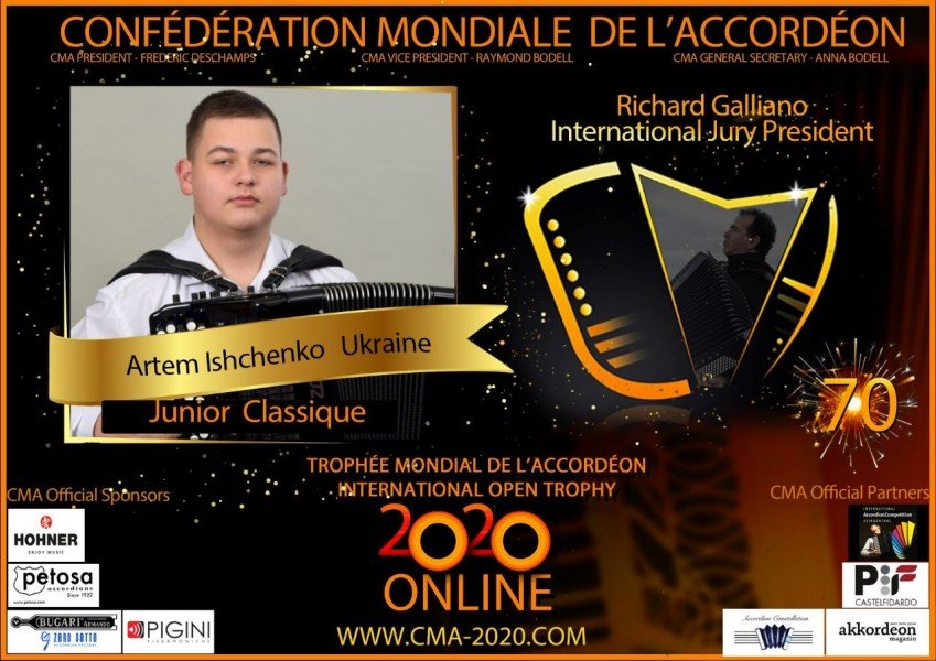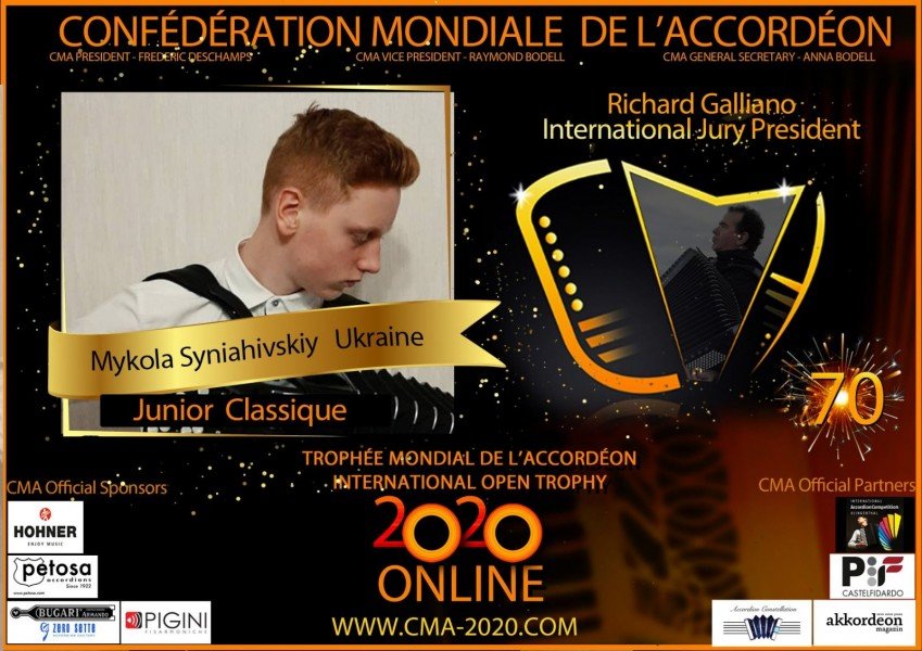 Прийнявши участь сольно у першому турі такого престижного професійного конкурсу, як CMA TROPHEE MONDIALE 2020, в якому прийняло участь 750 учасників з 50 країн світу та 110 членів журі з різних країн оцінювало виступи конкурсантів, наші хлопці пройшли до фіналу, який відбудеться 6 грудня, де обиратимуть 6 кращих виконавців світу по баяну та акордеону.