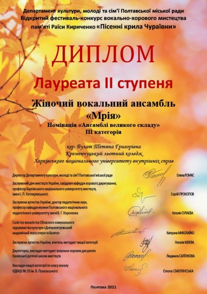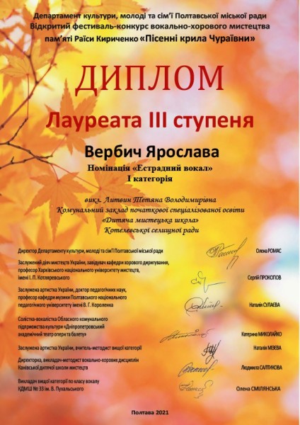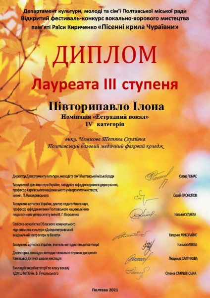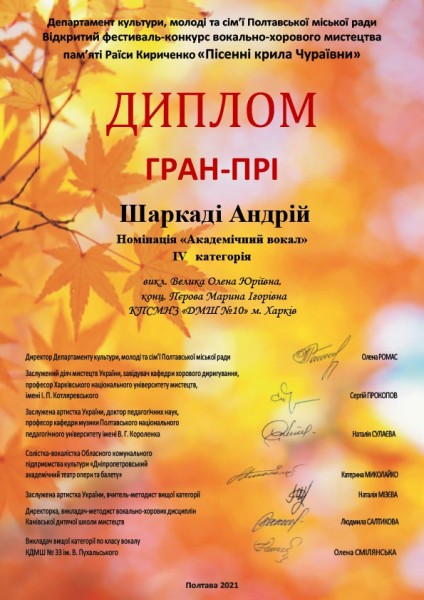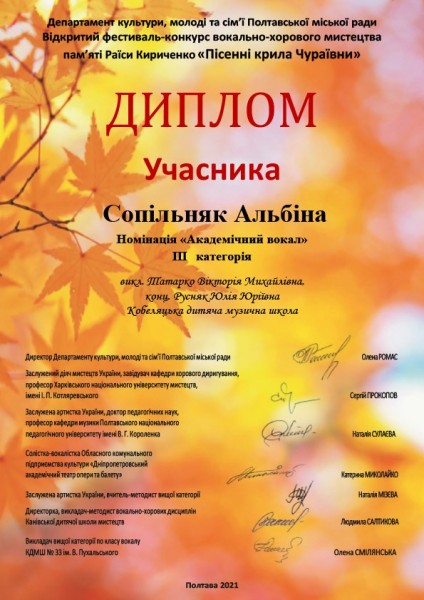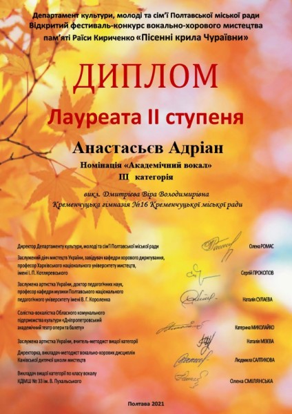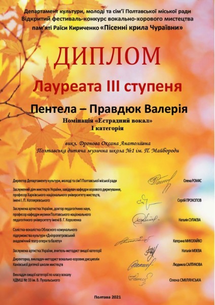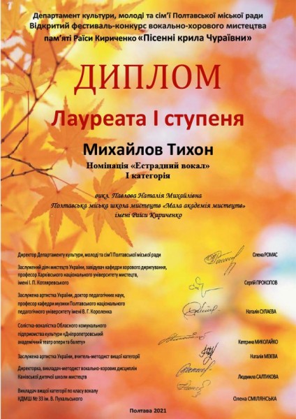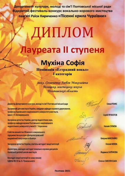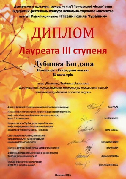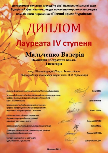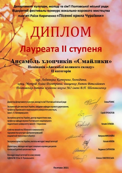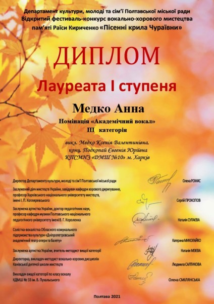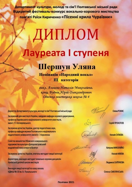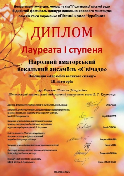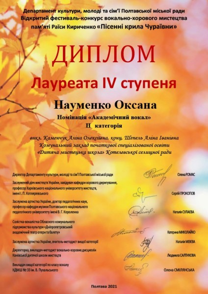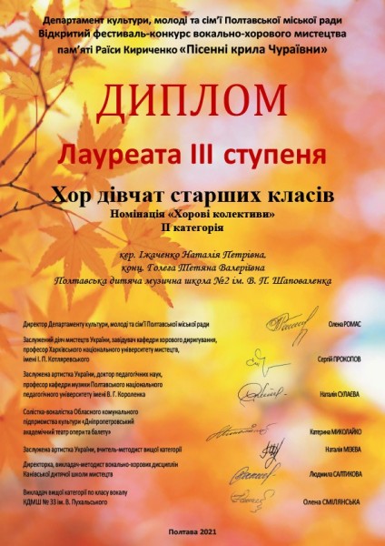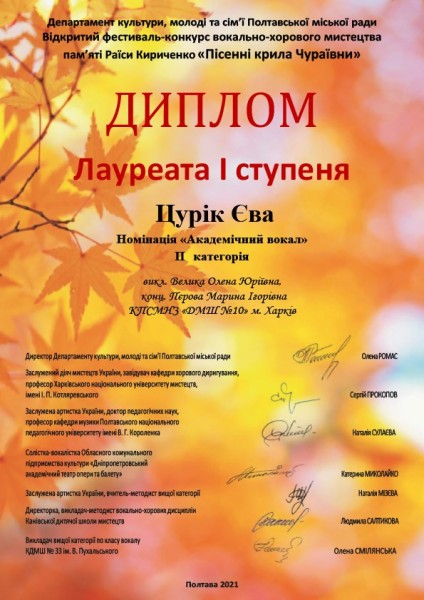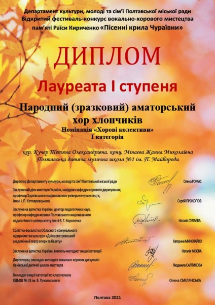 Дипломи Відкритого мистецького фестивалю-конкурсу вокально-хорового мистецтва пам'яті Раїси Кириченко "Пісенні крила Чураївни" 2021.