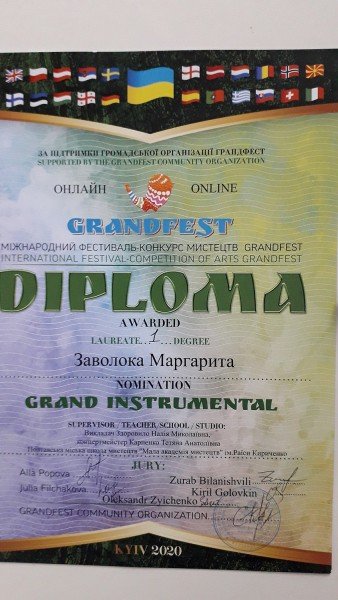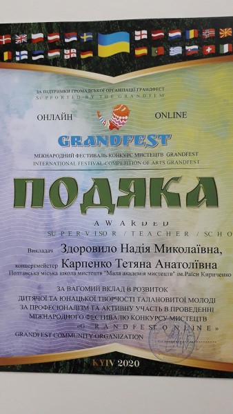 За підтримки Громадської організації «Грандфест» в травні відбувся дистанційний Міжнародний фестиваль-конкурс мистецтв Grandfest (м.Київ), у якому взяла участь учениця 4 класу по класу віолончелі Заволока Маргарита і отримала Диплом 1 ступеню. Подяками нагороджені викладач-методист оркестрового відділу Здоровило Надія Миколаївна та концертмейстер Карпенко Тетяна Анатоліївна.