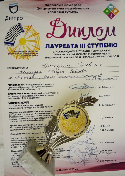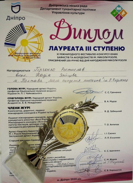 Учні Полтавської міської школи мистецтв «Мала академія мистецтв» імені Раїси Кириченко відділення народних інструментів (баян,акордеон) Слив’як Богдан та Гірченко Ростислав викладач Зайцева Н.П. взяли участь у ХІ Міжнародному конкурсі юних баяністів і акордеоністів імені Миколи Різоля у місті Дніпро.
