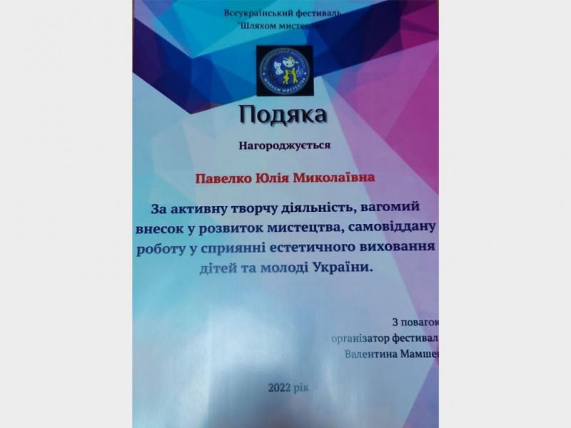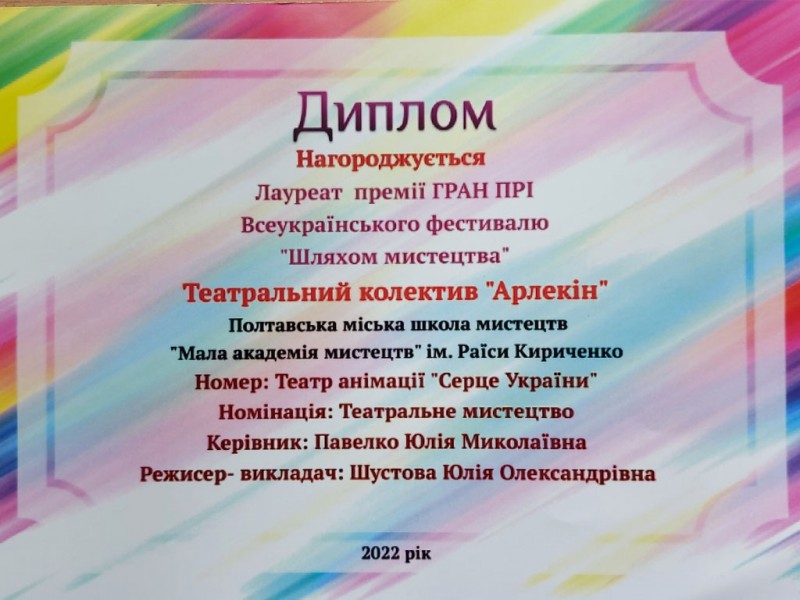 З величезною вдячністю, безмежною радістю та переповненим відчуттям гордості Театральний колектив "АРЛЕКІН" (кер. Ю. Павелко, викл. Ю. Шустова) повідомляє, що наша відеоробота "СЕРЦЕ УКРАЇНИ" під час літніх канікул отримала ГРАН-ПРІ на ІІ Міжнародному театральному фестивалі "CREATIVE" та Всеукраїнському фестивалі "ШЛЯХОМ МИСТЕЦТВА" !!!