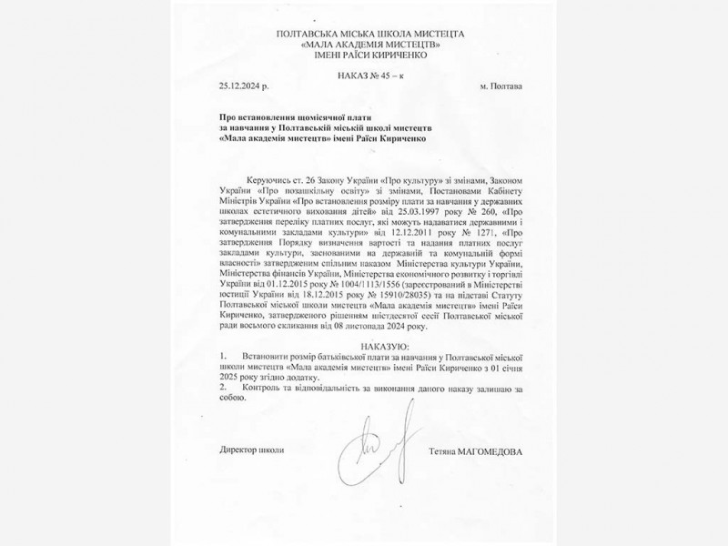 заслужений працівник культури України, член творчої спілки Асоціації діячів естрадного мистецтва України, Голова Ради директорів мистецьких шкіл Полтавської області Магомедова Тетяна Юріївна