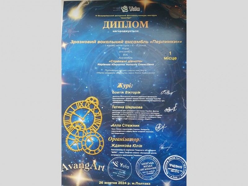 Щиро вітаємо Зразковий вокальний ансамбль «Перлинки» (кер. Наталія Кімнатна) з блискучою перемогою! 26 жовтня колектив взяв участь у IV Всеукраїнському двотуровому фестивалі-конкурсі мистецтв «АвангАрт» в офлайн-форматі та здобув заслужену нагороду за перше місце. Бажаємо ансамблю нових творчих звершень, натхнення та ще більше перемог!