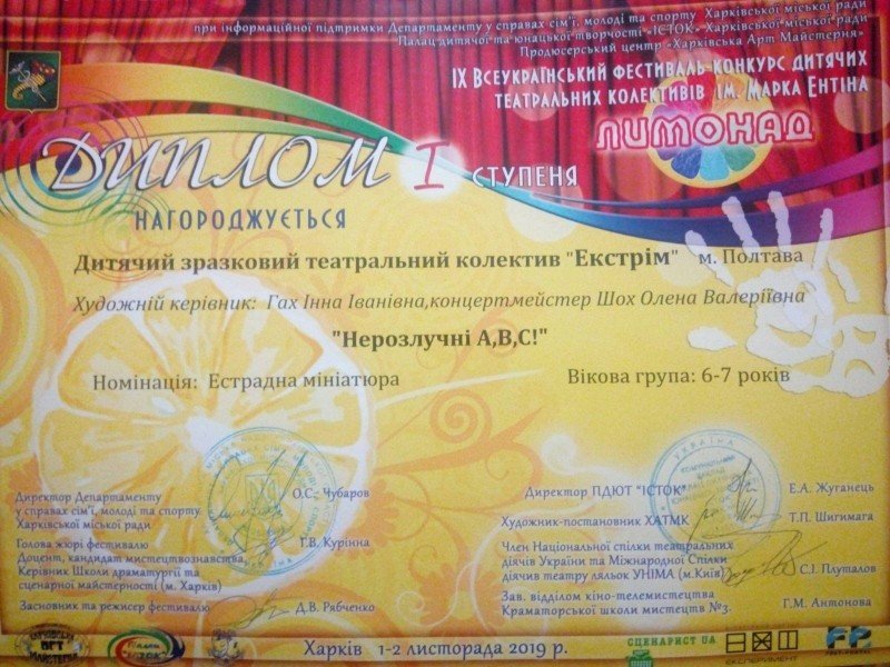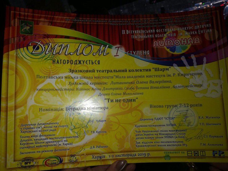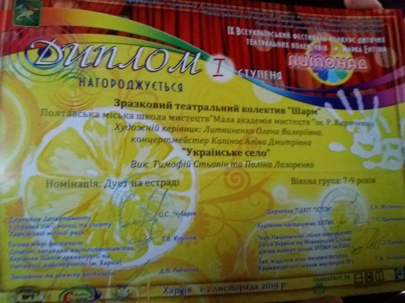 Творчі колективи театрального відділення Полтавської міської школи мистецтв «Мала академія мистецтв» імені Раїси Кириченко взяли участь у ІХ Всеукраїнському фестивалі-конкурсі дитячих театральних колективів ім. Марка Ентіна «Лимонад» м. Харьків.