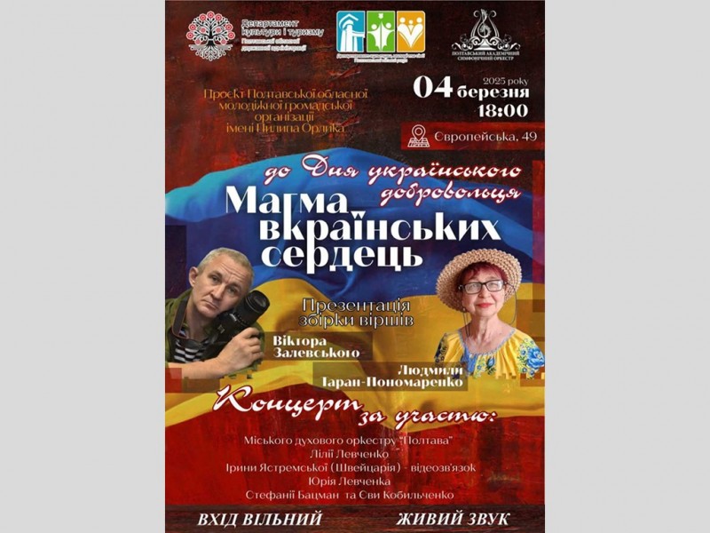 4 березня 2025 року в приміщенні Полтавського симфонічного оркестру відбувся мистецький захід, присвячений Дню українського добровольця, поєднаний із презентацією збірки віршів «МАГМА ВКРАЇНСЬКИХ СЕРДЕЦЬ» сучасної полтавської поетеси Людмили Таран-Пономаренко. У заході взяли участь вихованці театрального колективу «Арлекін» Стефанія Бацман та Єва Кобильченко під керівництвом Юлії Павелко та концертмейстера Наталії Омельницької.