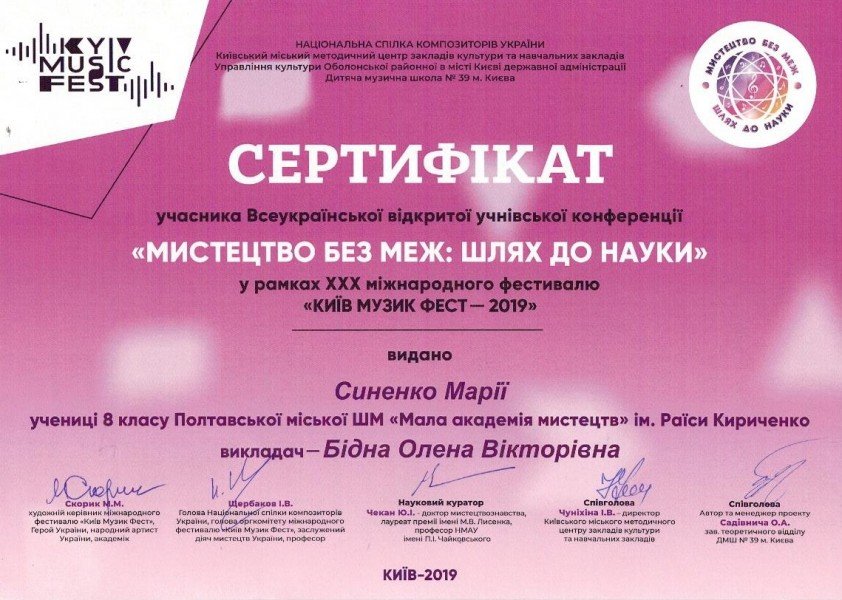 4- 5 жовтня в рамках 30 Міжнародного фестивалю «Київ Музик Фест» під патронатом Мирослава Скорика відбулася Всеукраїнська конференція з теоретичних предметів серед учнів мистецьких шкіл «Мистецтво без меж: шлях до науки».
