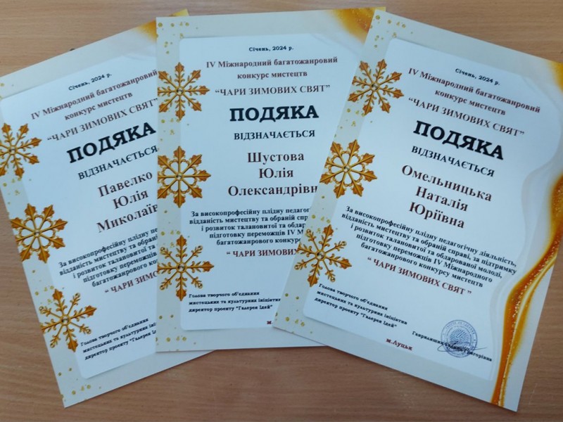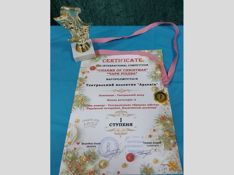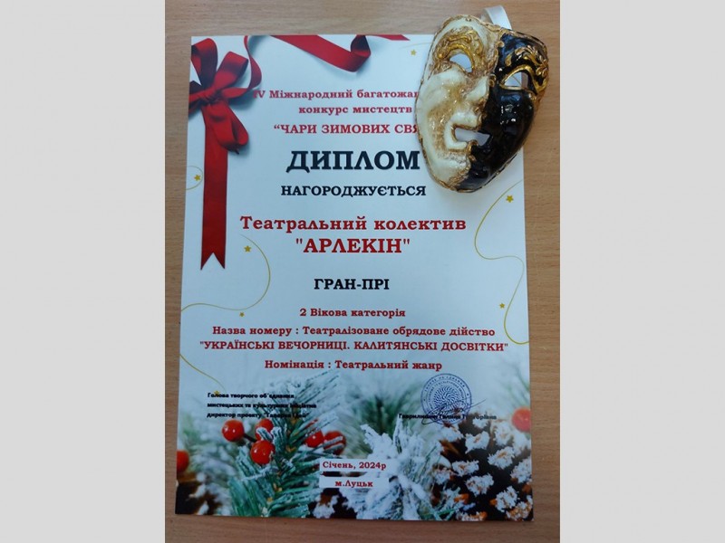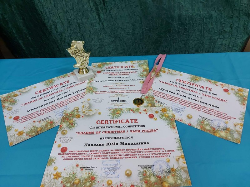 ДИПЛОМ ЛАУРЕАТІВ І ступеню за участь у Міжнародному конкурсі "ЧАРИ РІЗДВА" (м. Рівне) і стали володарем ГРАН-ПРІ на Міжнародному багатожанровому конкурсі "ЧАРИ ЗИМОВИХ СВЯТ" (м. Луцьк)!!!