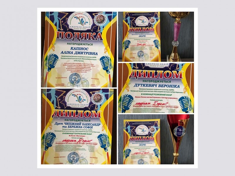 4 грудня у місті Києві відбувся Міжнародний фестиваль-конкурс мистецтв "Джерело надій", де прийняли участь вихованці Полтавської міської школи мистецтв "Мала академія мистецтв" імені Раїси Кириченко. Учні зразкового театрального колективу "Шарм" (кер. Олена Литвиненко та конц. Аліна Капінос) показали високий рівень майстерності та отримали найвищі нагороди.