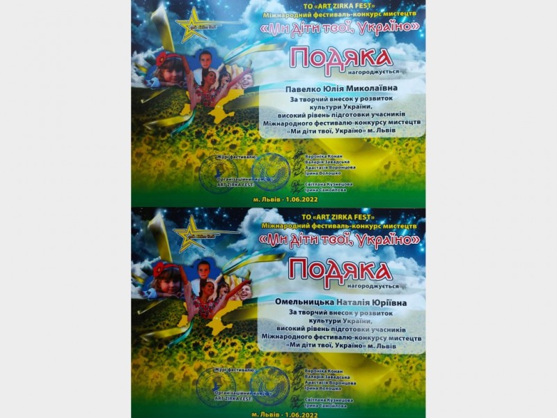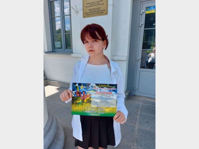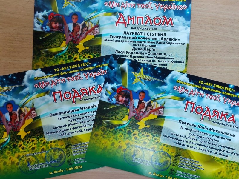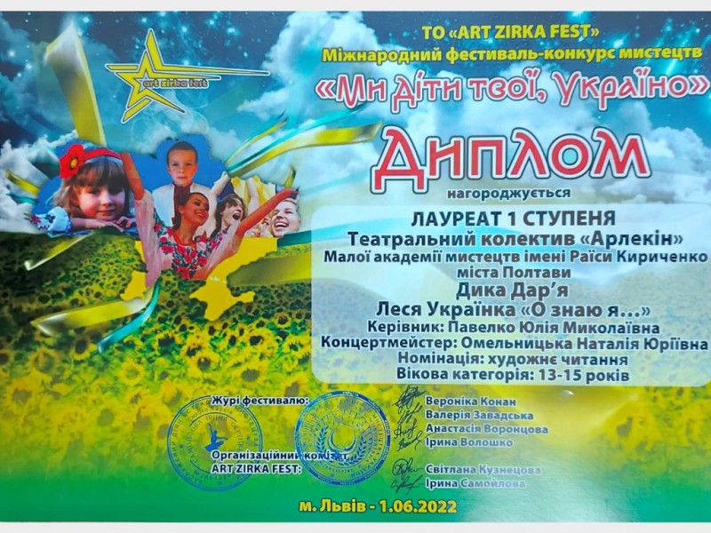 01 червня у м. Львів відбувся Міжнародний конкурс-фестиваль «Ми діти твої, Україно!». Вітаємо учасницю театрального колективу "АРЛЕКІН" Полтавської міської школи мистецтв "Мала академія мистецтв" імені Раїси Кириченко ДИКУ ДАР'Ю з отриманням ДИПЛОМУ ЛАУРЕАТА І ступеню в номінації «Художнє читання» (кер. Павелко Ю.М., конц. Омельницька Н.Ю.) за творчий внесок у розвиток культури України.