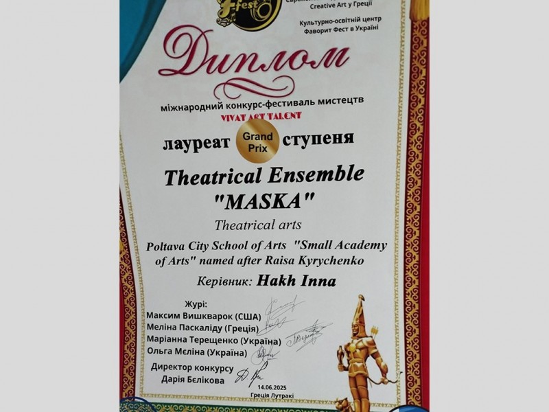 Зразковий театральний колектив «Maska» (керівник — Інна Гах) здобув Гран-прі на престижному Міжнародному фестивалі-конкурсі мистецтв «Vivat Art Talent», що відбувся в червні у мальовничому місті Лутракі (Греція).