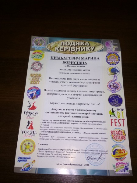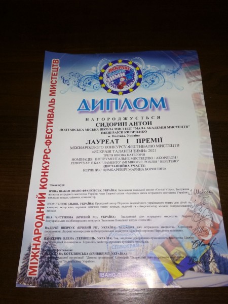 24 січня у м. Івано-Франківську відбувся Міжнародний фестиваль-конкурс «Яскраві таланти зими». З відділу народних інструментів (баян, акордеон) в цьому конкурсі брав участь Сидорин Антон (викладач Цимбаревич М.Б.) де посів I місце.