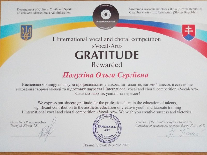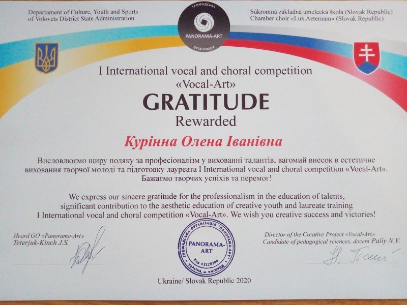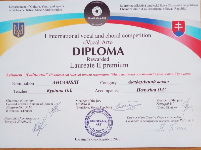 Учасники ансамблю Дзвіночок відділення початкового естетичного виховання у складі малої форми (квінтет) прийняли участь у першому міжнарадному конкурсі вокально-хорового мистецтва "Vocal- Art "у номінації академічний вокал та отримали Другу премію!