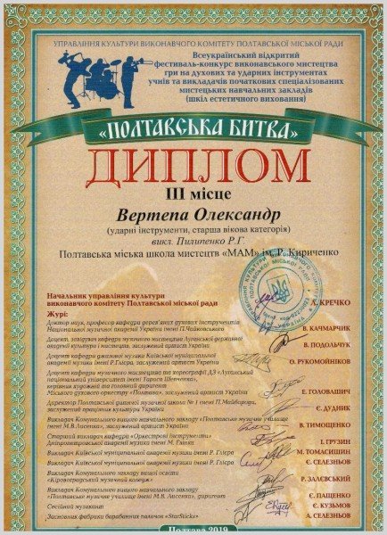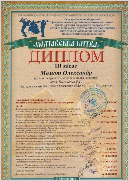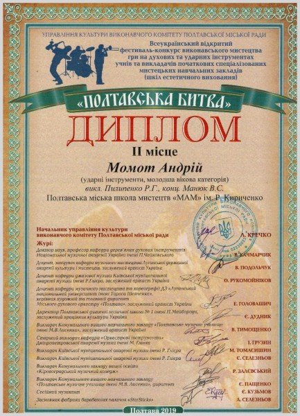 - Момота Андрія - Лауреат 2 ступеню (викл. Пилипенко Р.Г., конц. Манюк В.С.)