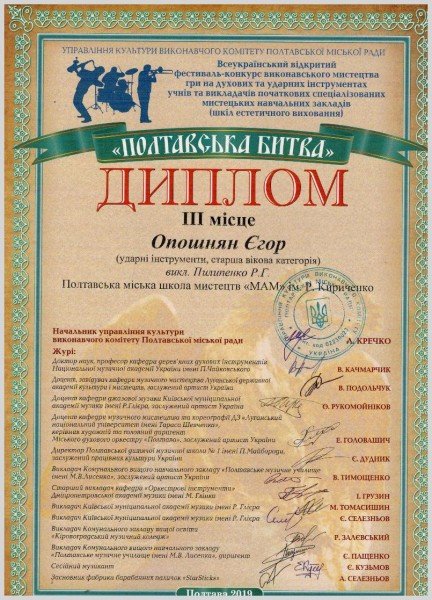 - Опошнян Єгора - Лауреат 3 ступеню (викл. Пилипенко Р.Г.)