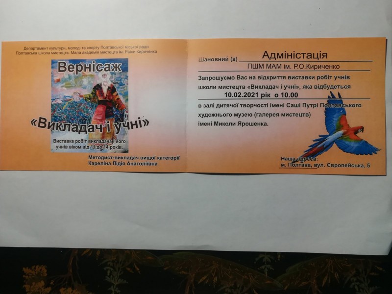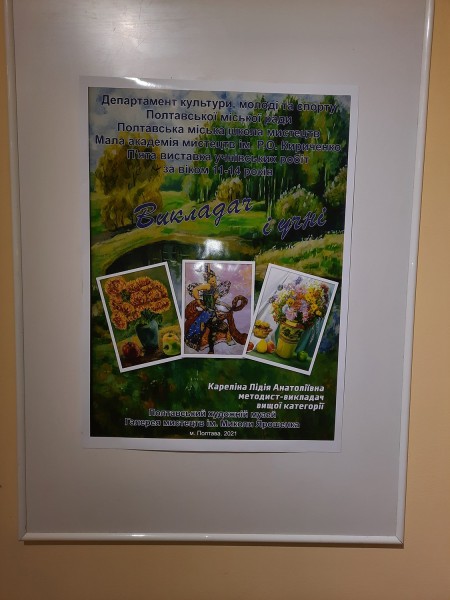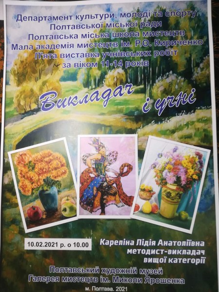 У Полтавському художньому музеї (галерея мистецтв) імені Миколи Ярошенко в залі дитячої творчості імені Саші Путрі проходить виставка учнівських робіт образотворчого відділу Полтавської міської школи мистецтв “Мала академія мистецтв ” імені Раїси Кириченко, класи методиста-викладача вищої категорії - Кареліної Лідії Анатоліївни.