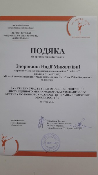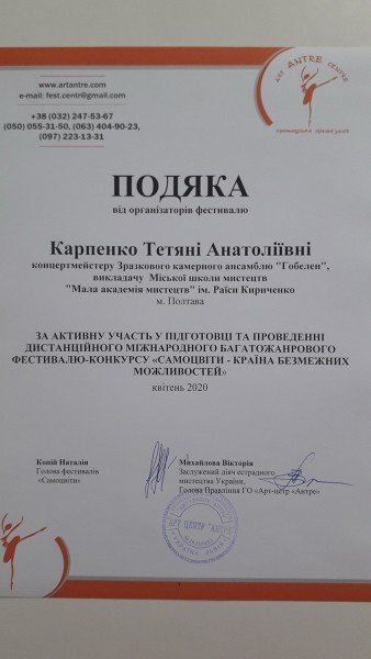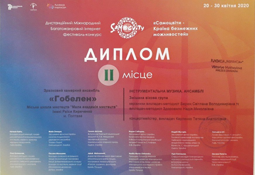 Зразковий камерний ансамбль «Гобелен» взяв участь у дистанційному Міжнародному багатожанровому фестивалі-конкурсі «Самоцвіти - країна безмежних можливостей». За свій виступ ансамбль отримав Диплом 2 ступеню в номінації «Інструментальна музика. ансамблі»