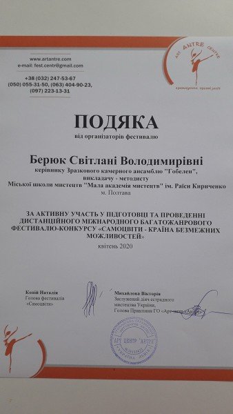 Від організаторів конкурсу керівник ансамблю Берюк С.В. ,викладач Здоровило Н.М.,концертмейстер Карпенко Т.А. получили Подяку за активну участь у підготовці та проведенні цього фестивалю –конкурсу.