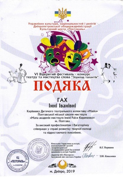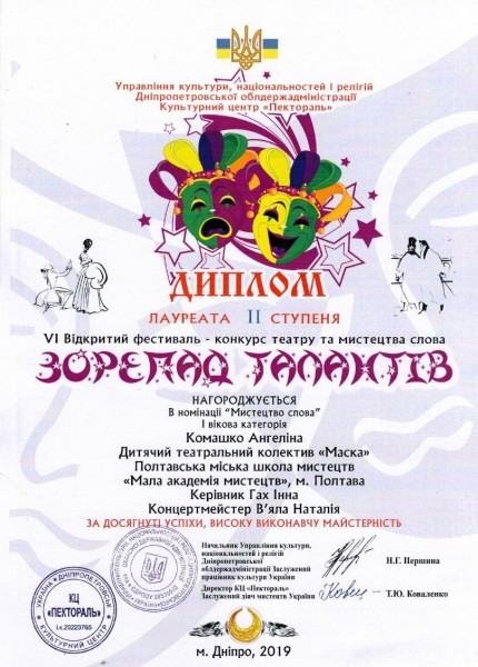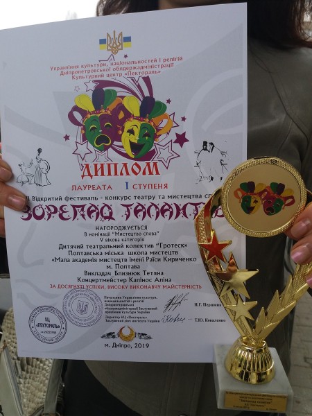 13 квітня 2019 р. у м. Дніпро відбувся VІ Відкритий фестиваль-конкурс театру та мистецтва слова «Зорепад талантів». В ньому взяли учать: