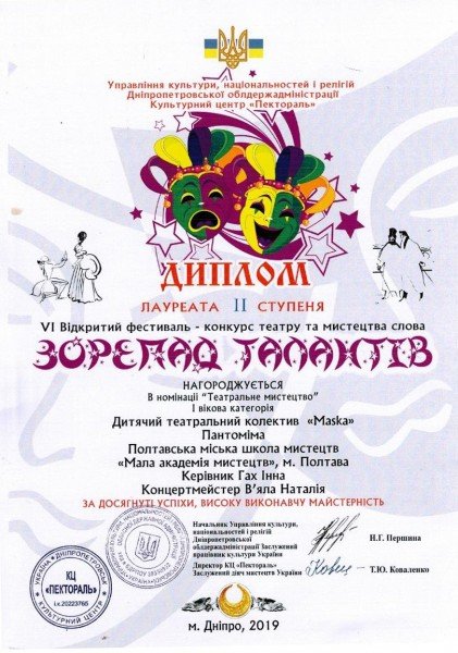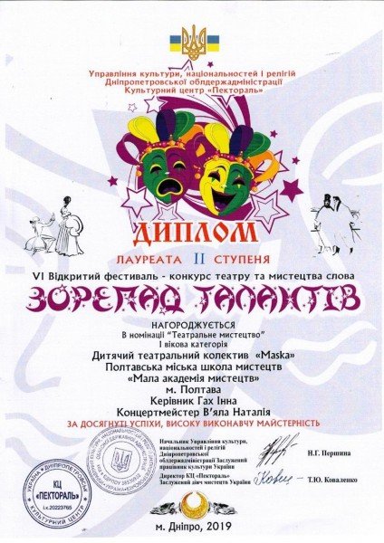 - зразковий театральний колектив «Маска» (керівник – Гах І.І.) – лауреат 2 ступеню у номінації «Театральне мистецтво» та «Мистецтво слова».