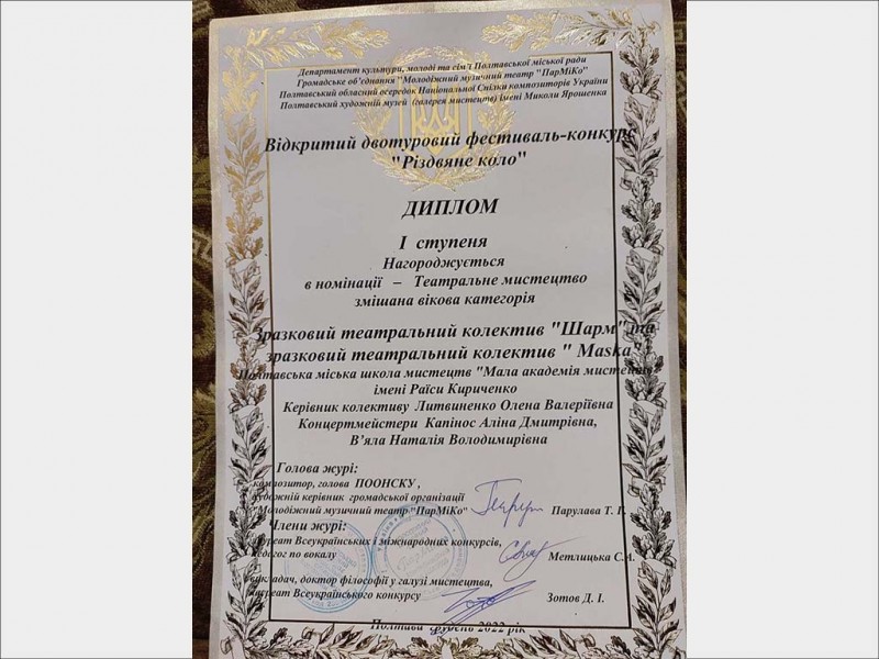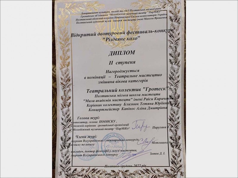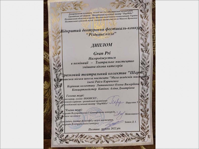 23 грудня 2022 року у місті Полтава відбувся Відкритий двотуровий фестиваль-конкурс "Різдвяне коло", де прийняли участь вихованці Полтавської міської школи мистецтв "Мала академія мистецтв" імені Раїси Кириченко: Зразковий театральний колектив "Шарм " (кер. Олена Литвиненко, конц. Аліна Капінос), Зразковий театральний колектив "Maska" (кер. Олена Литвиненко, конц. Наталія В'яла) та театральний колектив "Гротеск" (кер. Тетяна Близнюк, конц. Аліна Капінос). Журі конкурсу відзначило високий рівень акторської майстерності, творчі здібності дітей та режисерський задум у представлених театральних виставах. Колективи отримали Гран-Прі, І та ІІ призові нагороди.