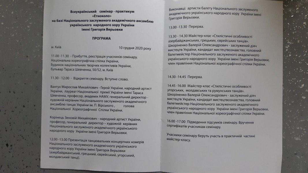 Національна хореографічна спілка України за підтримки Міністерства культури та інформативної політики України 10 грудня 2020 року провела у місті Києві Всеукраїнський семінар практикум «Етноколо».