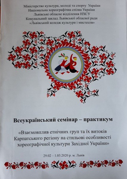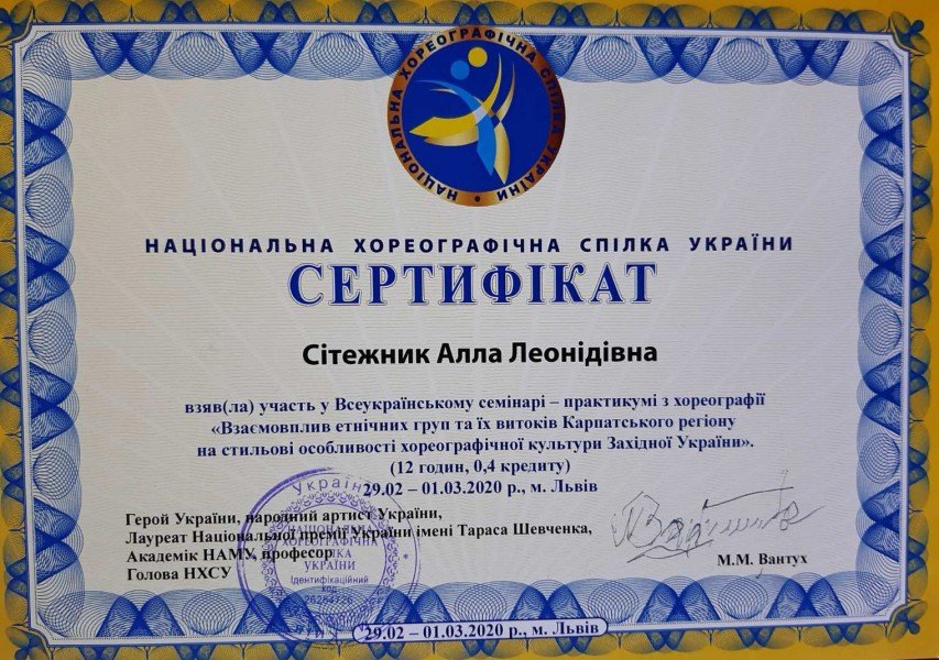 29.02- 01.03.2020 року в м. Львів пройшов Всеукраїнський семінар – практикум з хореографії «Взаємовплив етнічних груп та їх витоків Карпатського регіону на стильові особливості хореографічної культури Західної України». Завідувачка хореографічним відділенням,керівник зразкового хореографічного колективу «Юнона» Алла Леонідівна Сітежник