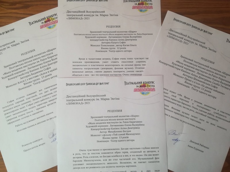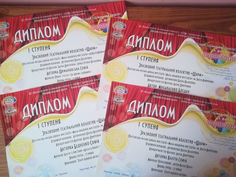 15 квітня вихованці зразкового театрального колективу «Шарм» (керівник - Олена Литвиненко, концертмейстери - Аліна Капінос та Тетяна Скиба) прийняли участь у Всеукраїнському театральному дистанційному конкурсі ім. Марка Ентіна «ЛИМОНАД» та отримали призові місця у номінації – «Театр одного актора»