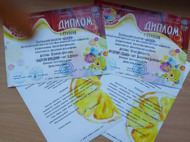 Нещодавно учасниці театрального колективу "АРЛЕКІН" (кер. Юлія Павелко, конц. Наталія Омельницька), Пєшкова Ярослава і Чітам Джульєтт, які знаходяться за кордоном, прийняли участь у Всеукраїнському театральному фестивалі "ЛИМОНАД" імені Марка Ентіна та отримали ДИПЛОМИ 1 СТУПЕНЮ у номінації – театр одного актора.