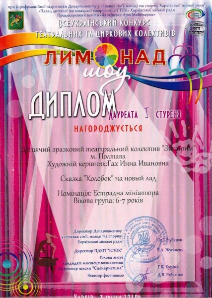 - Естрадна мініатюра: Дитячий зразковий театральний колектив «Екстрим» (кер. Гах І.І.) – лауреат 1 ступеню.