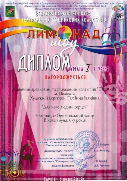 - Оригінальний жанр: Дитячий зразковий театральний колектив «Екстрим» (кер. Гах І.І.) – лауреат 1 ступеню;