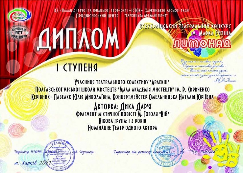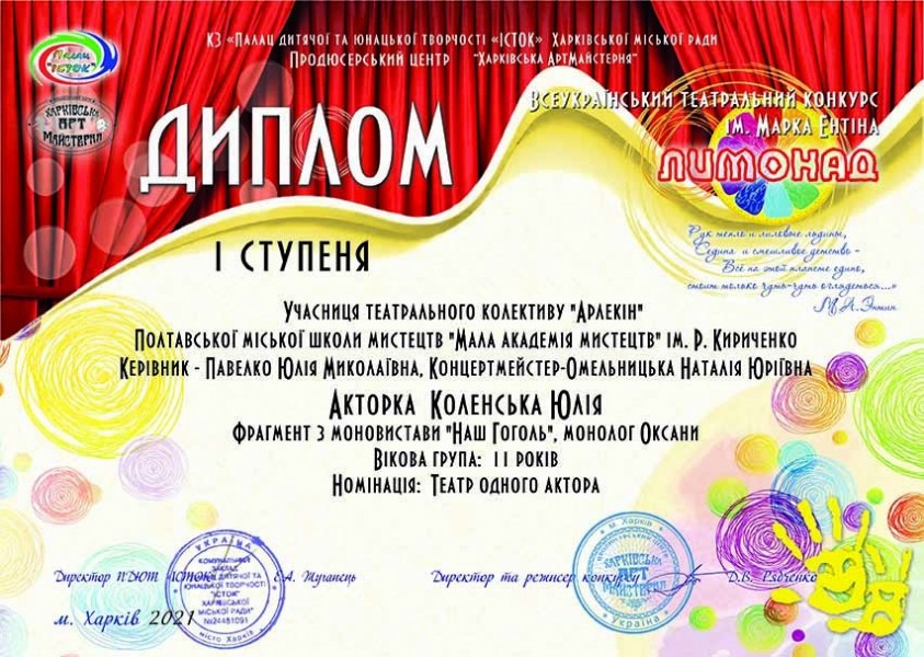 Рогінська Кіра, Коленська Юлія та Дика Даша (кер.Ю.Павелко, конц.Н.Омельницька) взяли участь у Всеукраїнському театральному фестивалі-конкурсі ім.Марка Ентіна (м.Харків, лютий-2021).