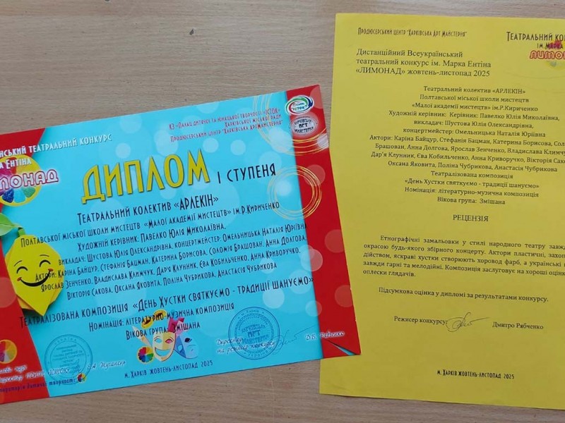 Вітаємо театральний колектив «АРЛЕКІН» (кер. Юлія Павелко, викл. Юлія Шустова, конц. Наталія Омельницька) з блискучою перемогою у Всеукраїнському театральному конкурсі імені Марка Ентіна «Лимонад» (м. Харків)!