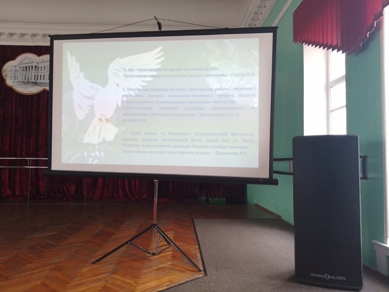 - методична доповідь на тему: «Виставкова робота – важлива і невід'ємна частина навчально-виховного процесу відділів образотворчого та декоративно-ужиткового мистецтва», яку представили завідуючі відділів образотворчого та декоративно-ужиткового мистецтва Конопльова С.М. та Кучерук Я.В.;