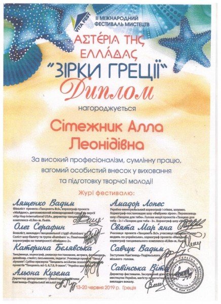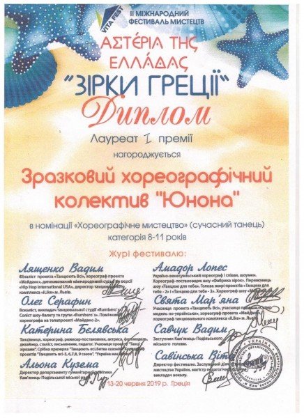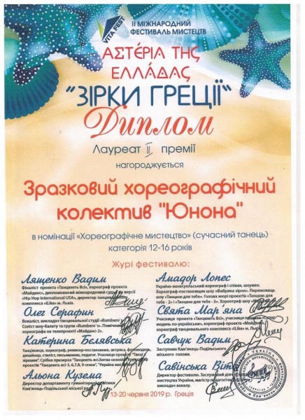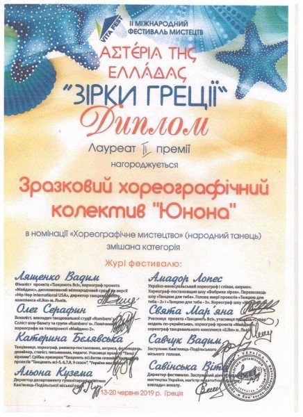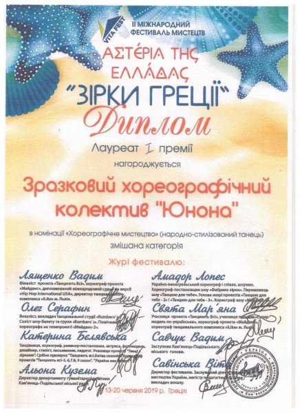 13-20 червня у Греції відбувся ІІ Міжнародний фестиваль мистецтв «Зірки Греції», в якому брав участь зразковий хореографічний колектив «Юнона»