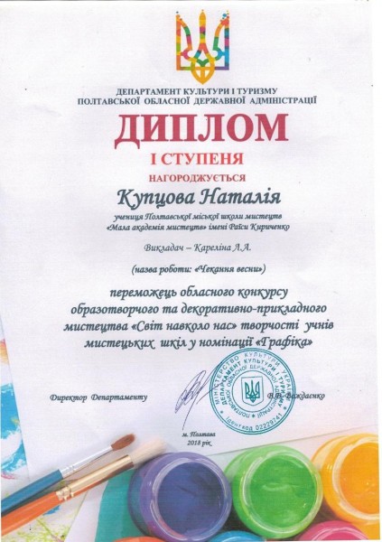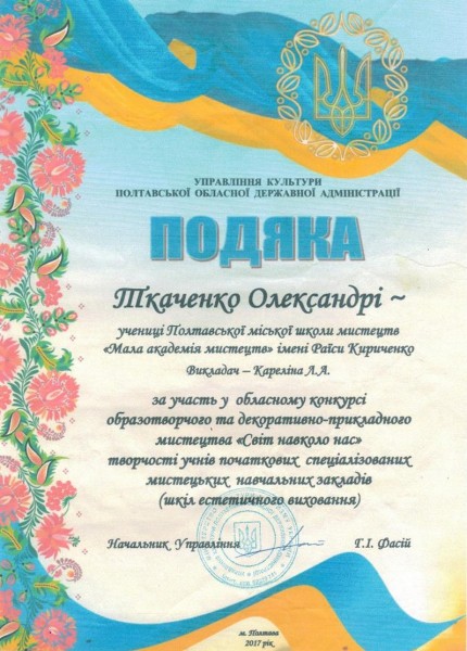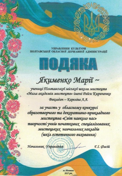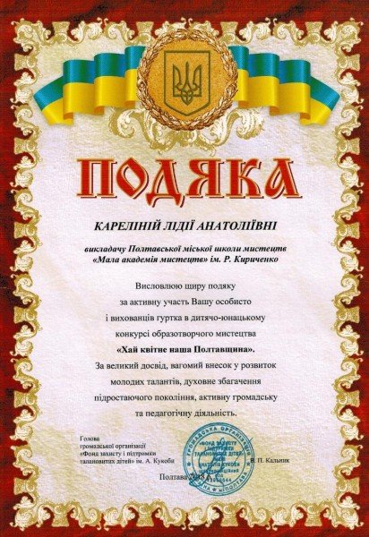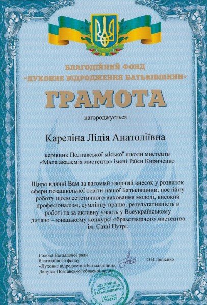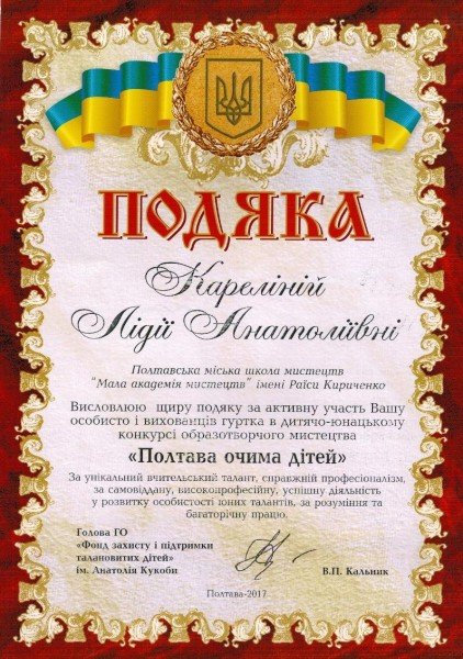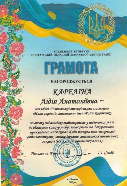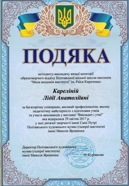 За всі роки викладацької діяльності учні стали колегами, архітекторами, художниками. Як викладач та методист-викладач: учні постійно мають здобутки у сфері образотворчого мистецтва: переможці у Міжнародних, Всеукраїнських, обласних конкурсах різного ґатунку по різним предметам свого навчання, мали переможні місця на обласних (конкурсах) олімпіадах: «Чарівний олівець». Неодноразово виставляли свої роботи у «Вернісажі» під назвою «Викладач і учні» в залі ім. Саші Путрі, Полтавського художнього музею ім. Миколи Ярошенка, виїзна виставка «Мій кришталевий янгол» - Державний музей ім. Т.Шевченка у м. Каневі.